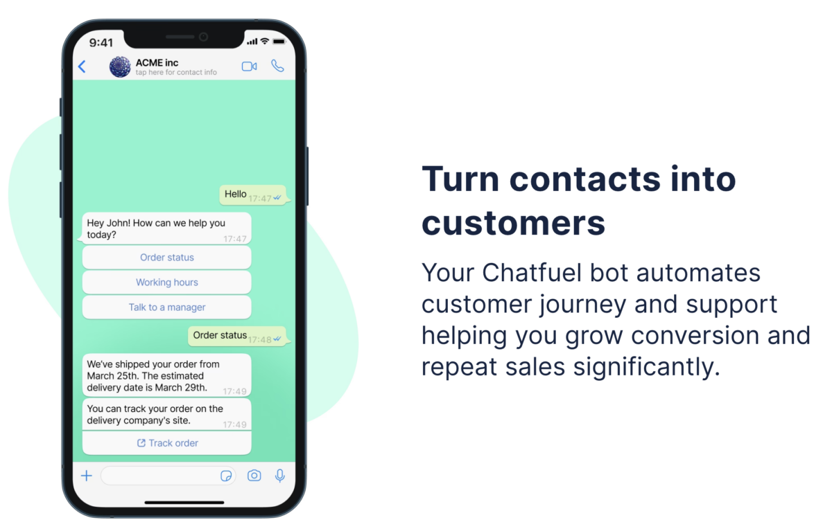 Among all the different tools available on the market, Chatfuel stands out as one of the best options for WhatsApp (in addition to Facebook Messenger et. al.) communication. It can help business owners with numerous tasks, including re-engagement and converting abandoned carts. The chatbot also provides customer support to users and collects feedback from buyers.