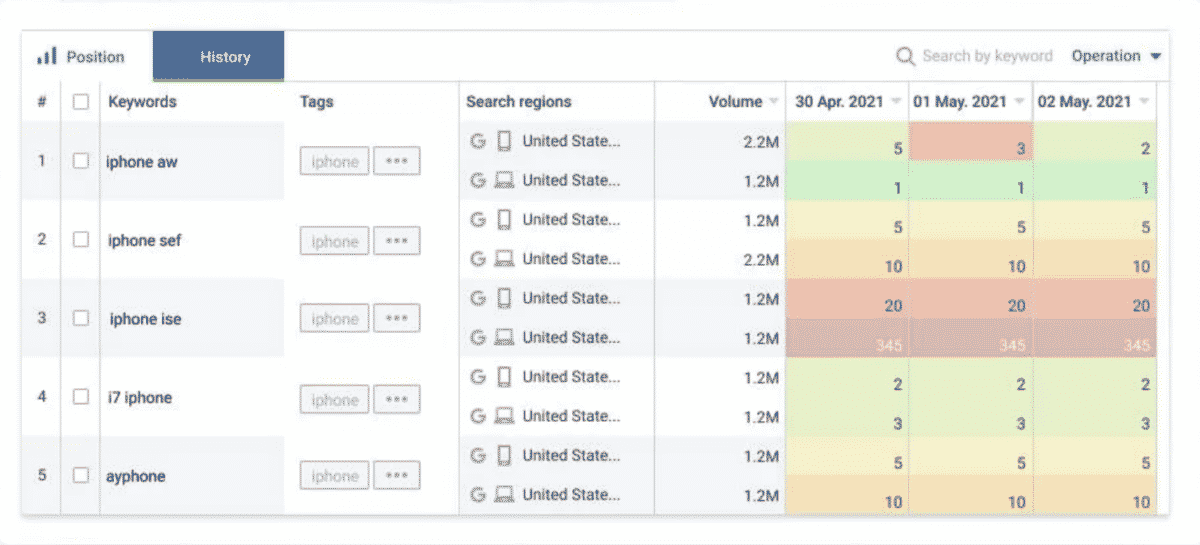 Just finding keywords isn’t enough to optimize your SEO. That’s because some keywords are more popular than others. These differences can be due to relevance, awareness of an issue, or other factors. Here is a sample of a keyword search done inside Serpstat which shows search volumes by keyword variation.