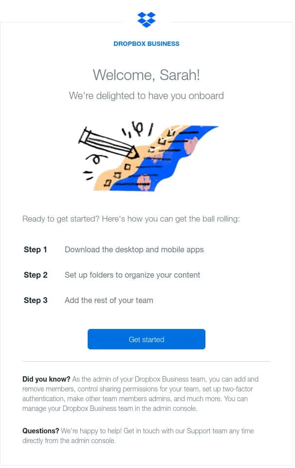 Dropbox utilizes a straightforward approach in their welcome email, as well. The email briefly welcomes the new user, then offers an immediate CTA in the form of educating the user on how to set up their Dropbox account and begin using it. It does so in a set of three instructions that are clear and concise.