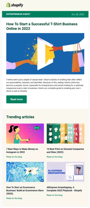 Shopify sends out helpful, informative newsletters that maintain focus and offer clear calls to action. These emails maintain a conversational tone while offering useful tools for businesses.