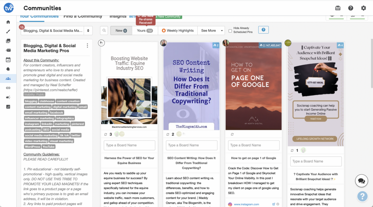 Tailwind Communities (formerly called Tribes) is a part of the Tailwind tool discussed above. It allows you to join or participate in “communities” related to your niche and both find pins to curate to keep your followers happy and boards active while also allowing you to publish pins to the tribe that others can repin as part of their content curation efforts.
